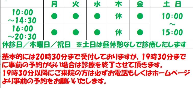 | 平日 10時~14時30分 16時~20時30分 土 10時~17時 ※平日の夜は予約がない場合に限り19:30で受付を終了させていただきます。来院される際は必ず事前予約をお願いいたします。 |